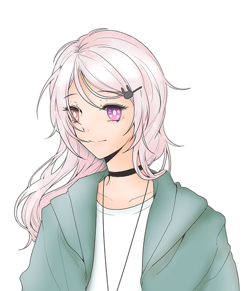 가장 먼저 눈에 띄는 것은 환한 은발. 전체적으로 분홍빛이 돌아 회분홍, 정확히는 은분홍에 가까울 색을 가진 머리카락을 어깨 너머까지 길렀다. 가장자리에서부터 중앙으로 갈수록 길어지는, 즉 완만한 V자 형태로 다듬어져 있기에 가장 긴 부분은 날개뼈를 다 덮는 길이. 자연스러운 곡선을 그리는 머리카락의 몇 가닥이 얼굴이며 눈을 찌르기도 하지만, 조금 길게 자른 앞머리의 대부분은 보는 사람 기준 오른쪽으로 모아져 핀으로 고정되어 있다. 토끼 모양의 플라스틱 장식이 달린 실핀은 후술할 목걸이에 걸려 있는 것과 같다. 즉, 목걸이에 있는 것이 여분.